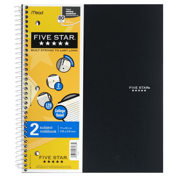 slide 1 of 1, Five Star 2 Subject Notebook, College Ruled, 120 ct