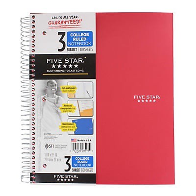 This Five Star College Ruled 3 Subject Notebook from Mead is top of its class. Containing 150 pages, this three subject college ruled notebook features a wire binding to keep pages sturdily intact whi…
