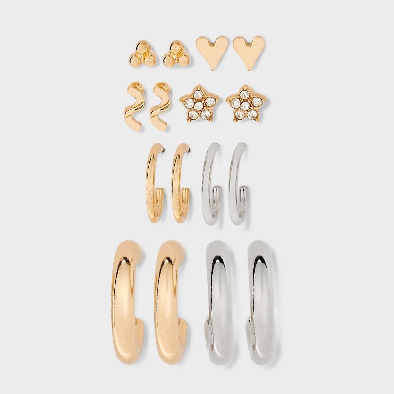 Add a perfect finishing touch to your looks with this Floral and Heart Stud and Hoop Earring Set from Universal Thread™. This eight-piece set in gold-tone and silver finish includes flower- and heart-…