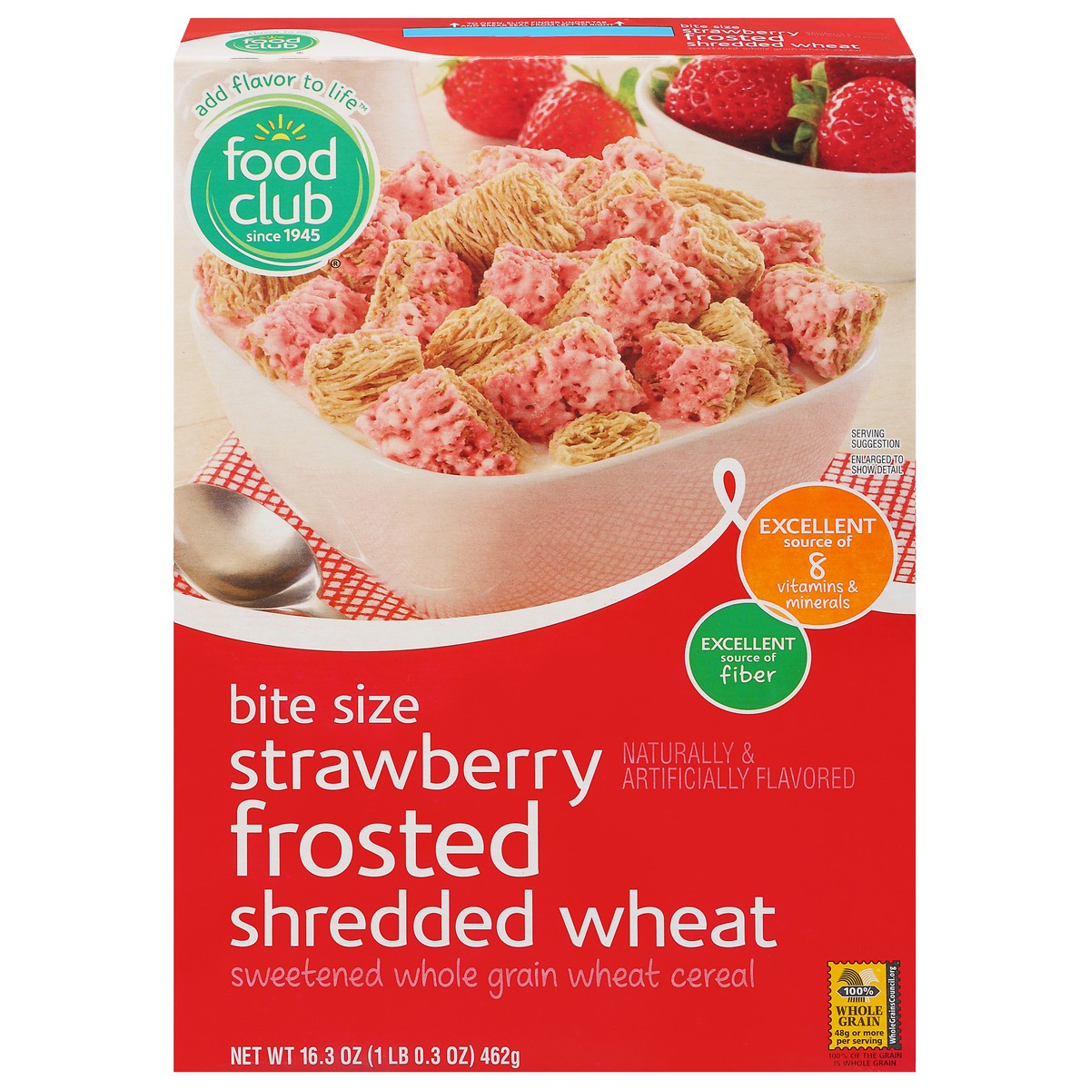 Add flavor to life. Since 1945. Make mornings amazing with Food Club bite size naturally & artificially flavored strawberry frosted shredded wheat cereal. Whole grain cereal sweetly frosted with straw…