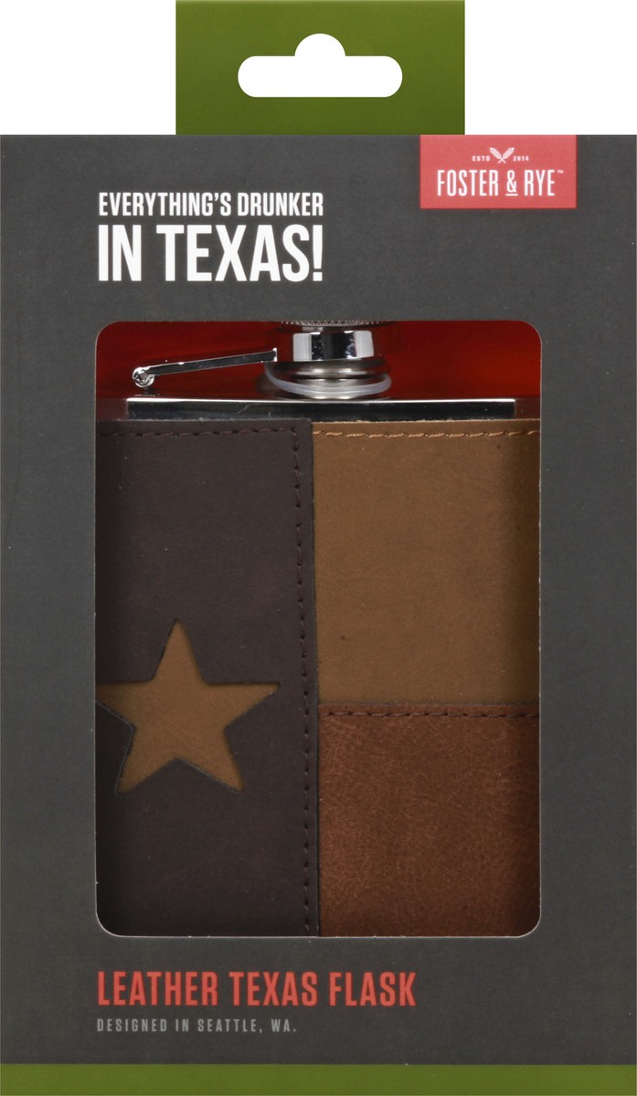 Everything's drunker in Texas. Keep spirits high with this 6 ounce stainless steal flask, outfitted with faux leather and country pride.Holds 6 oz304 Stainless Steel + Faux Leather WrapTwist & lift li…