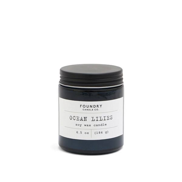 Foundry's Ocean Lilies 6.5 oz. soy-wax blended candle with a cotton wick features fresh fragrance notes of ocean air, sea moss, and driftwood. Our transparent navy glass jar with a screw on matte blac…
