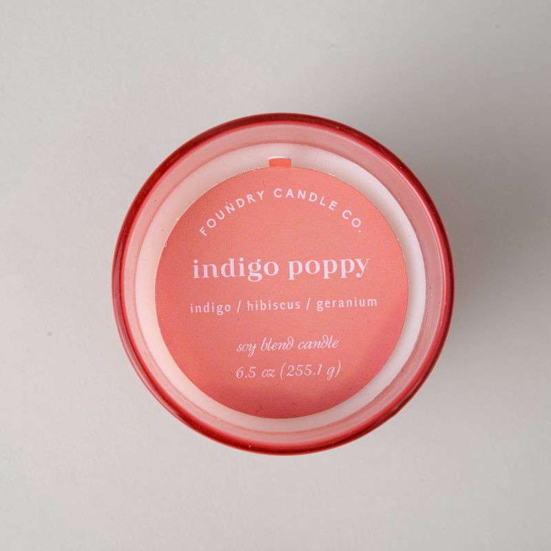 The Foundry Indigo Poppy 6.5oz Tinted Glass Candle offers a captivating fusion of vibrant floral notes and earthy undertones, creating an enchanting and soothing atmosphere. Encased in a stunning pinkā¦