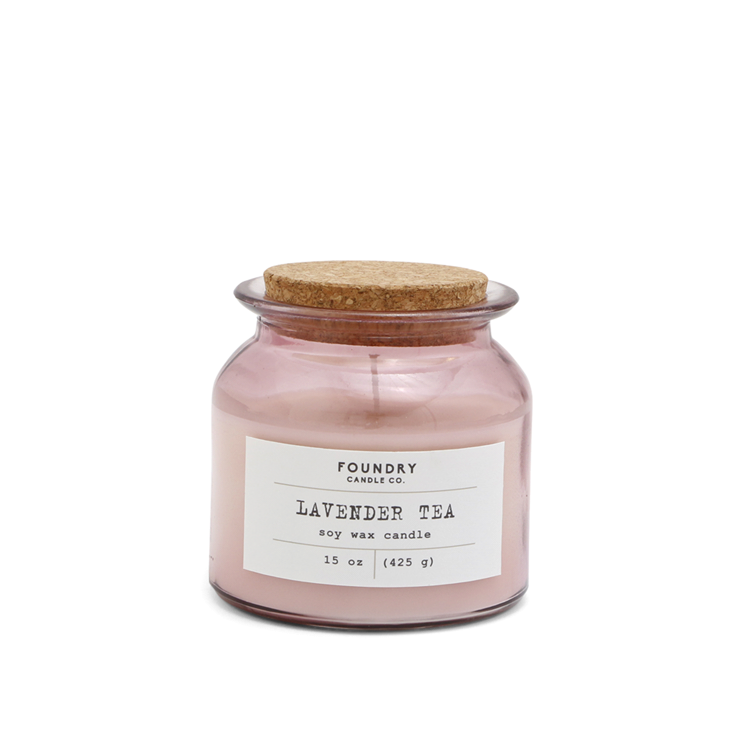 Foundry's Lavender Tea 15 oz. soy-wax blended candle with a cotton wick features fresh fragrance notes of eucalyptus leaves, blue sage, and lavender. Our apothecary style transparent blush glass jar w…