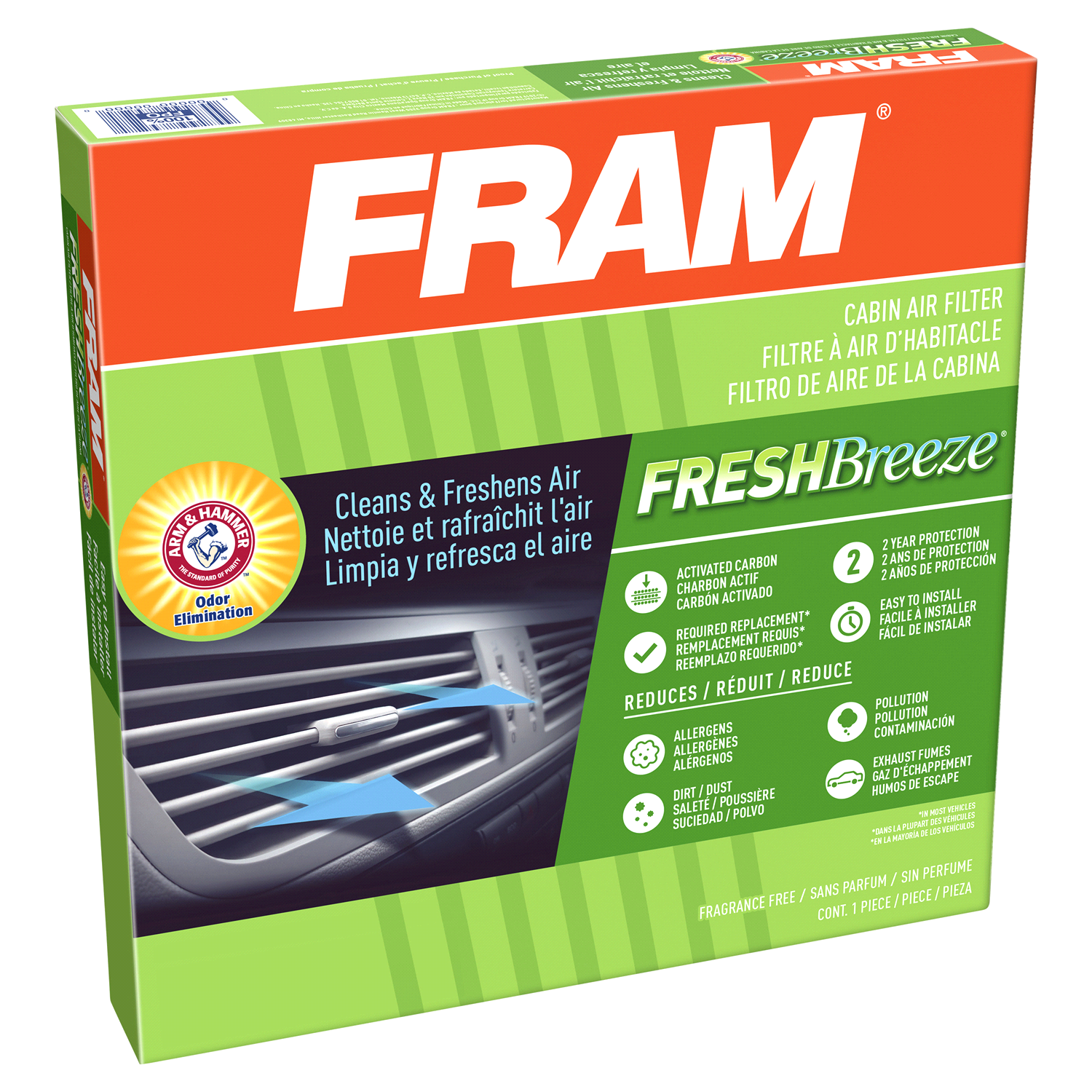 FRAM Fresh Breeze Cabin Air Filter is the only cabin air filter that uses the natural deoderizing qualities of Arm & Hammer baking soda. Helps absorb odors and freshens air. Filters out 98% of road du…