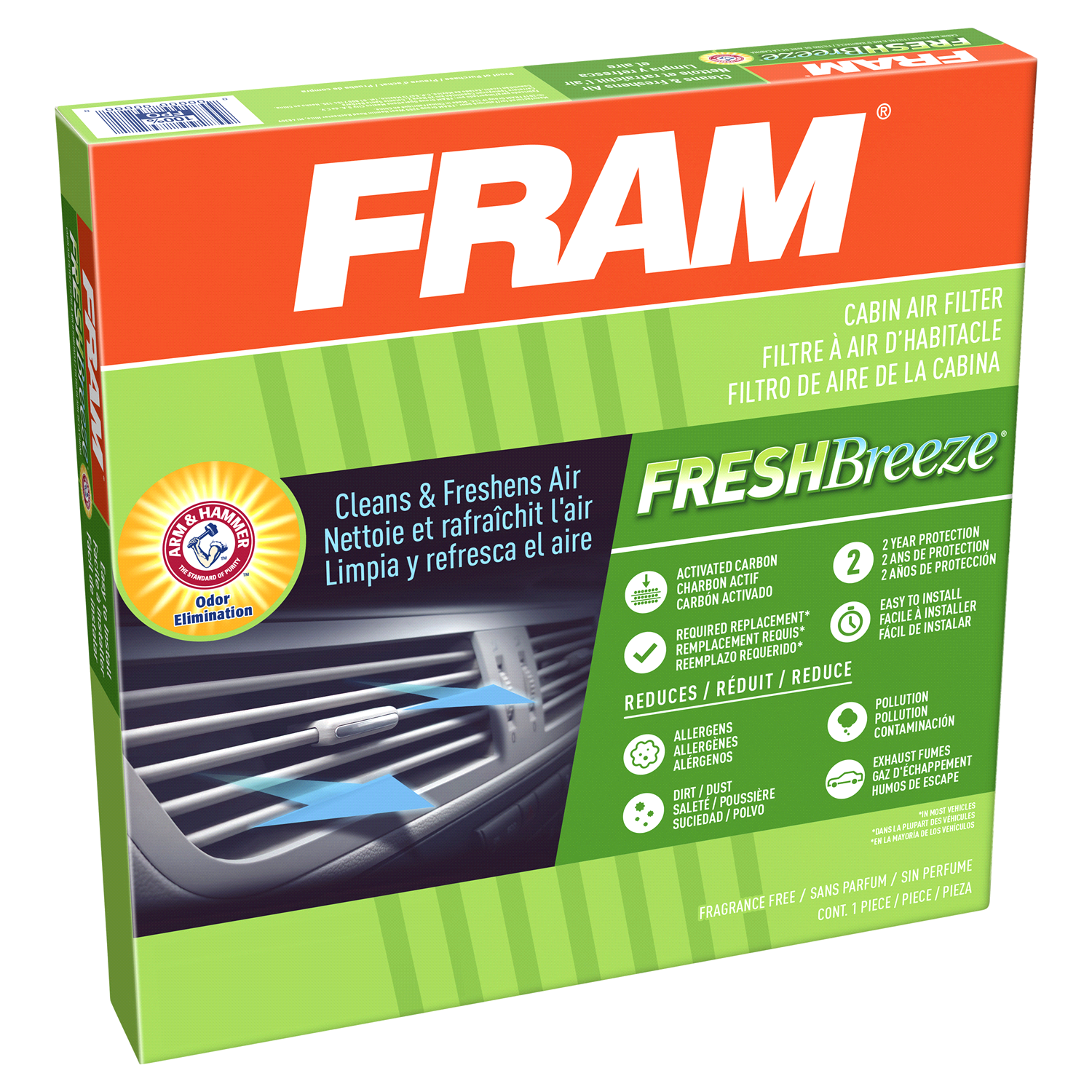 FRAM Fresh Breeze Cabin Air Filter is the only cabin air filter that uses the natural deoderizing qualities of Arm & Hammer baking soda. Helps absorb odors and freshens air. Filters out 98% of road du…