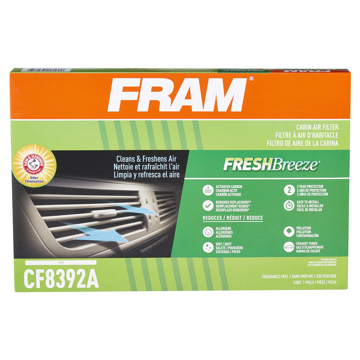 Fram Fresh Breeze Cabin Air Filter is the only cabin air filter that uses the natural deoderizing qualities of Arm & Hammer baking soda. Helps absorb odors and freshens air. Filters out 98% of road du…