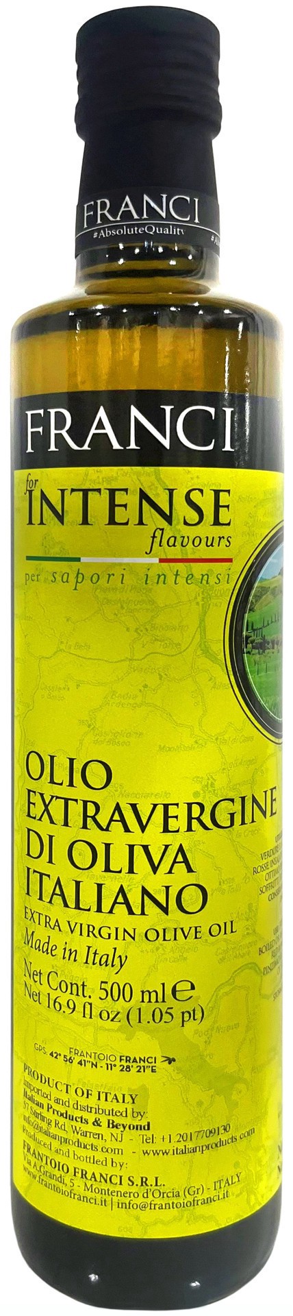 Frantoio Franci Intense Flavor Extra Virgin Olive Oil tastes intense and fresh, initially with slightly sweet flavor, followed by a palatable and harmonious bitter and spicy taste of high intensity, r…