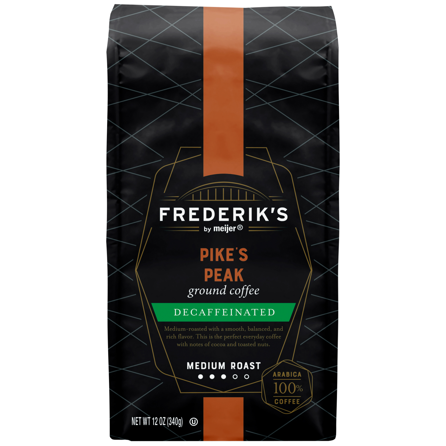 Frederik's by Meijer Decaf Pikes Peak Ground Coffee is a medium roast with a smooth, balanced and rich flavor and hints of cocoa and toasted nuts. Made from 100% Arabica beans sourced from premier gro…