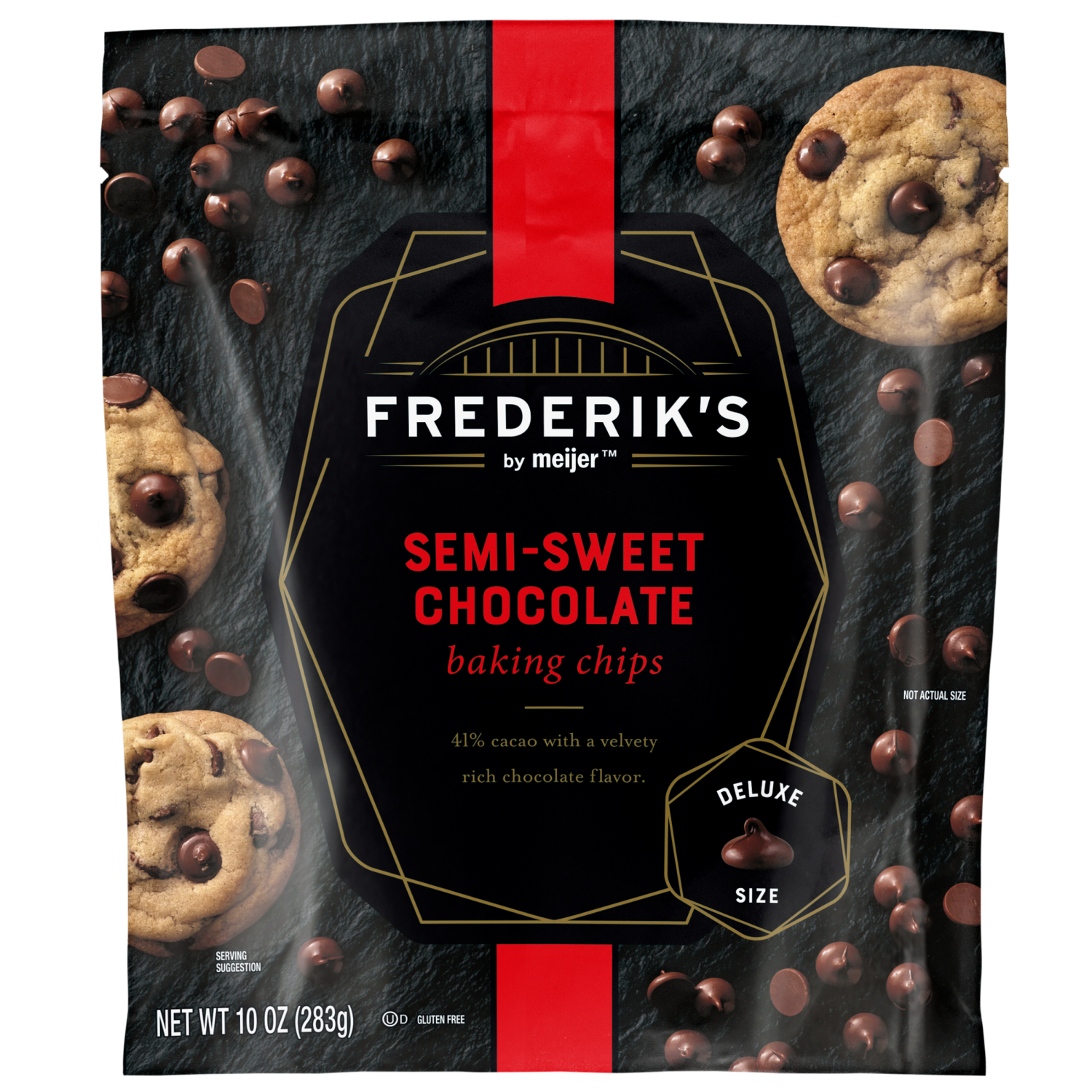 Welcome to Frederiks by Meijer Semi-Sweet Chocolate Chips. These great tasting chips come in a 10oz stand up pouch. Frederiks Semi-Sweet Chips are Deluxe Size making them perfect for snacking or stand…