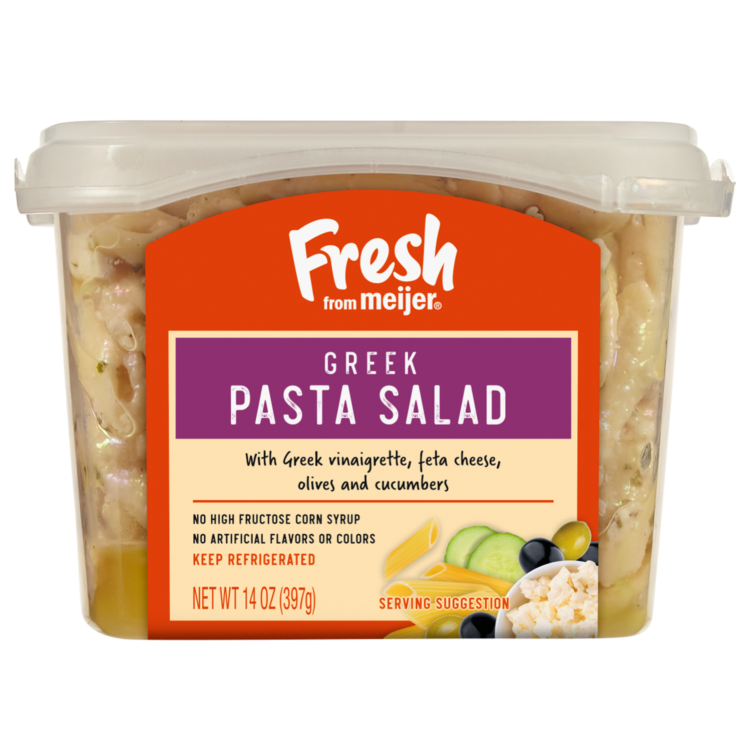 Fresh from Meijer Greek Pasta Salad is the mouthwatering side dish youve been craving. A beautiful mix of juicy olives, penne pasta, crispy cucumbers and rich feta cheese. Every bite transports your t…