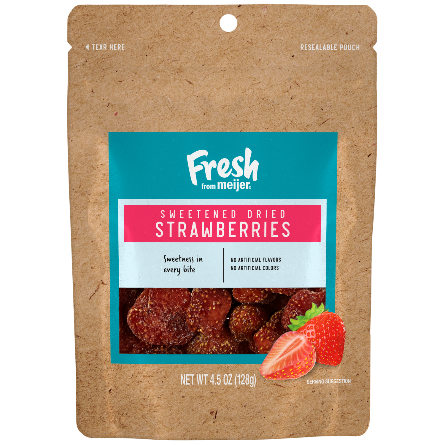 Relish in the sweetness of Fresh from Meijer Sweetened Dried Strawberries. These dried strawberries make a great snack or salad topper.