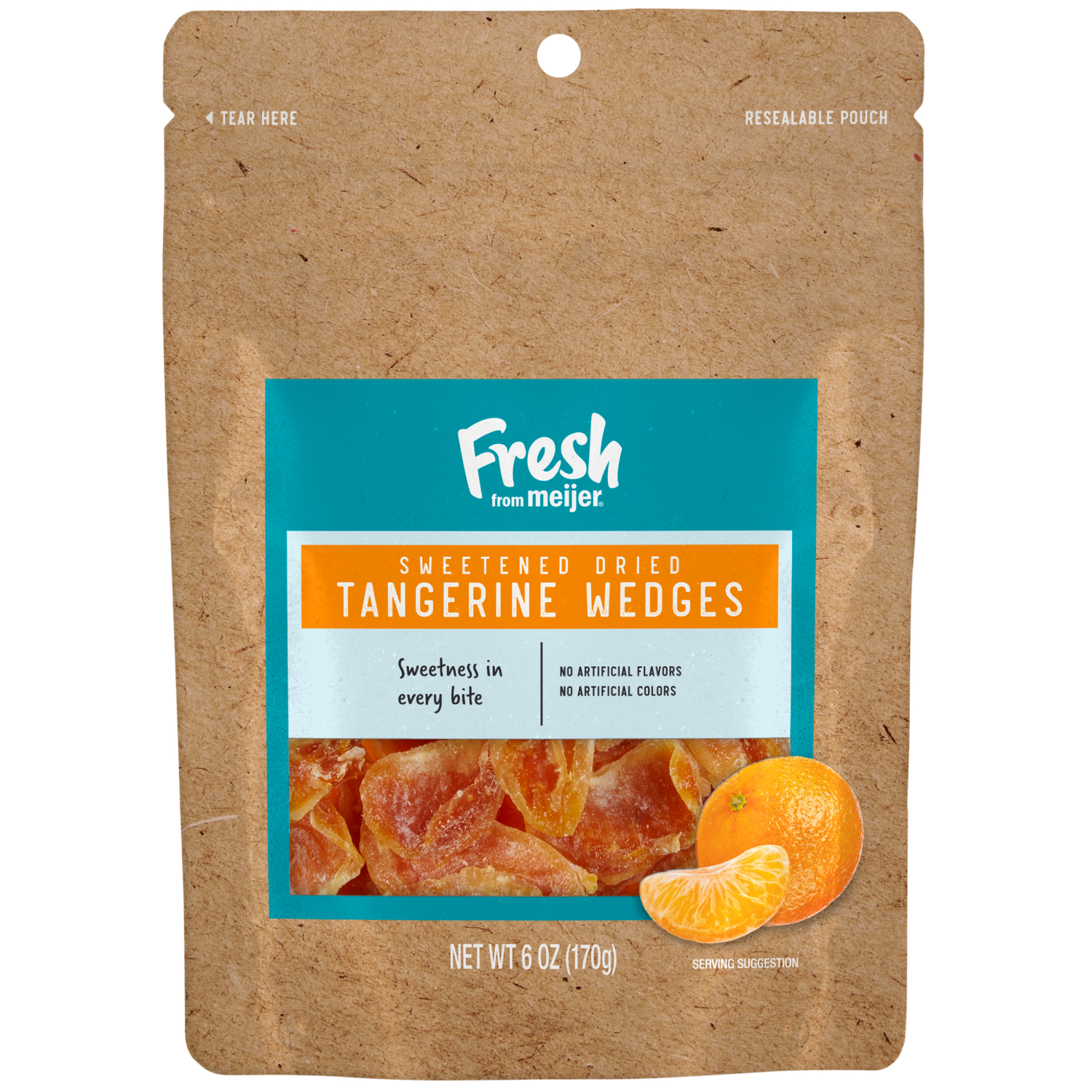 Relish in the sweetness of Fresh from Meijer Sweetened Dried Tangerine Wedges. These dried tangerines make a great snack or salad topper.
