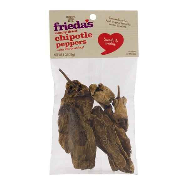 Frieda's Simply Dried Chipotle Peppers. Inspire taste love. ...Say chi-poat-lay! For medium-hot, heat in your favorite sauces & salsas. Sweet & smoky.