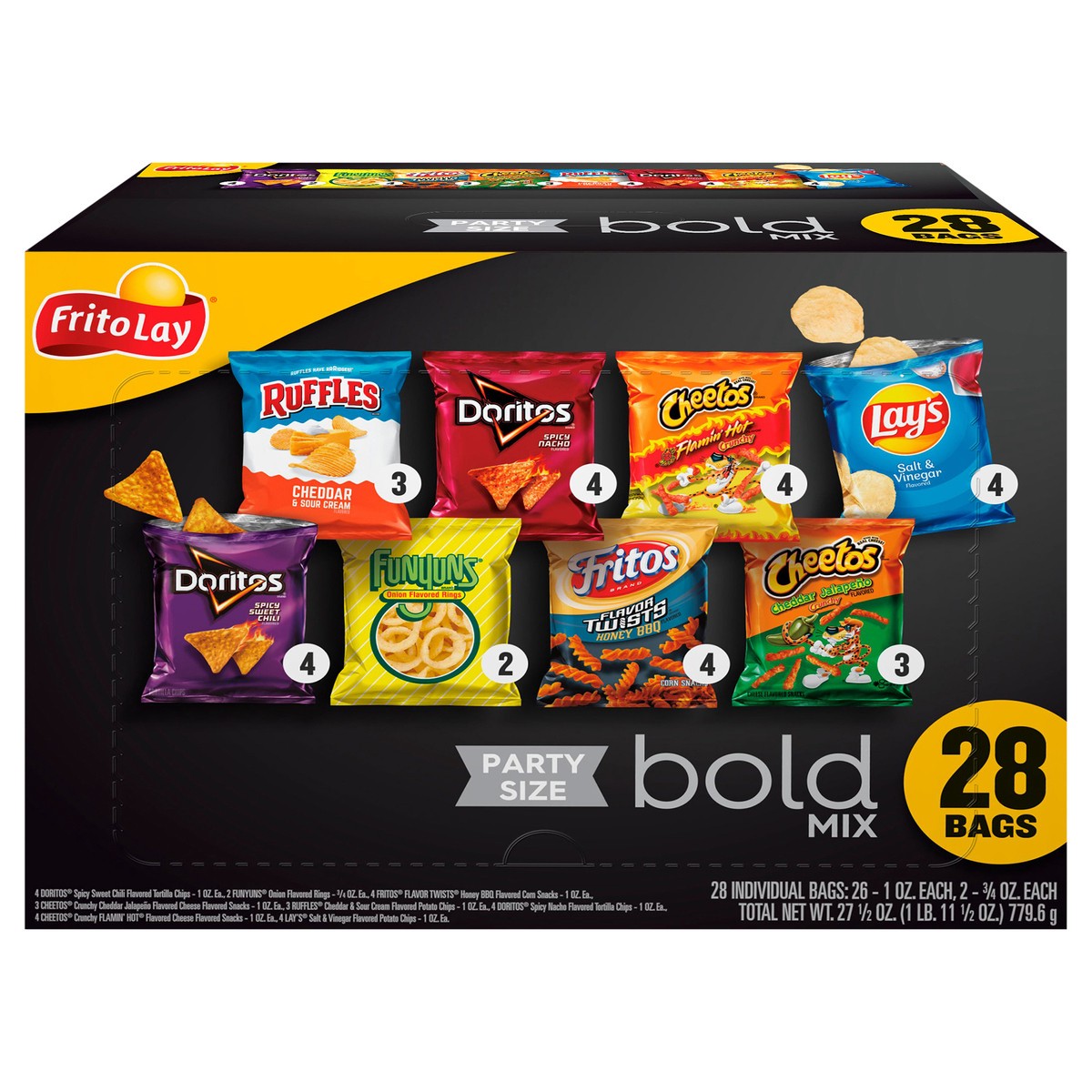 4 Doritos Spicy Sweet Chili Flavored Tortilla Chips - 1 oz. ea., 2 Funyuns Onion Flavored Rings - 0.75 oz. ea., 4 Fritos Flavor Twists Honey BBQ Flavored Corn Snacks - 1 oz. ea., 3 Cheetos Cheddar Jal…