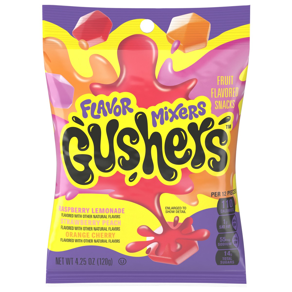 Gushers Fruit Flavored Snacks Flavor Mixers, Strawberry Peach, Orange Cherry, Raspberry Lemonade. Gluten Free; Kosher.