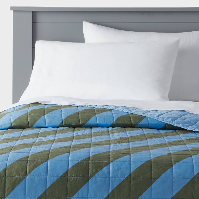 Bring timeless style to your child's bedroom with this Striped Quilt from Pillowfort™. This microfiber quilt is made from 100% recycled polyester with recycled polyester lining and polyester-rayon ble…
