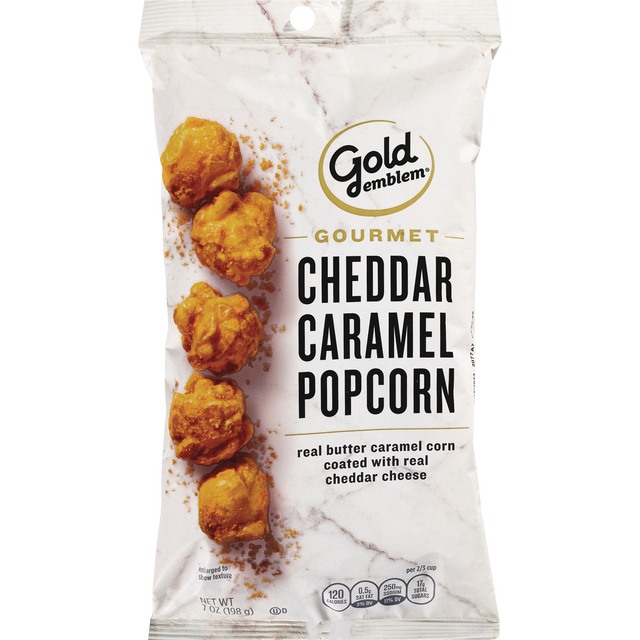 Gourmet cheddar caramel popcorn. Crunchy snack. Sweet and savory. 120 calories per serving. 7-oz. Add a bit of great-tasting crunch to your day with Gold Emblem Gourmet Cheddar Caramel Popcorn, 7 oz. …