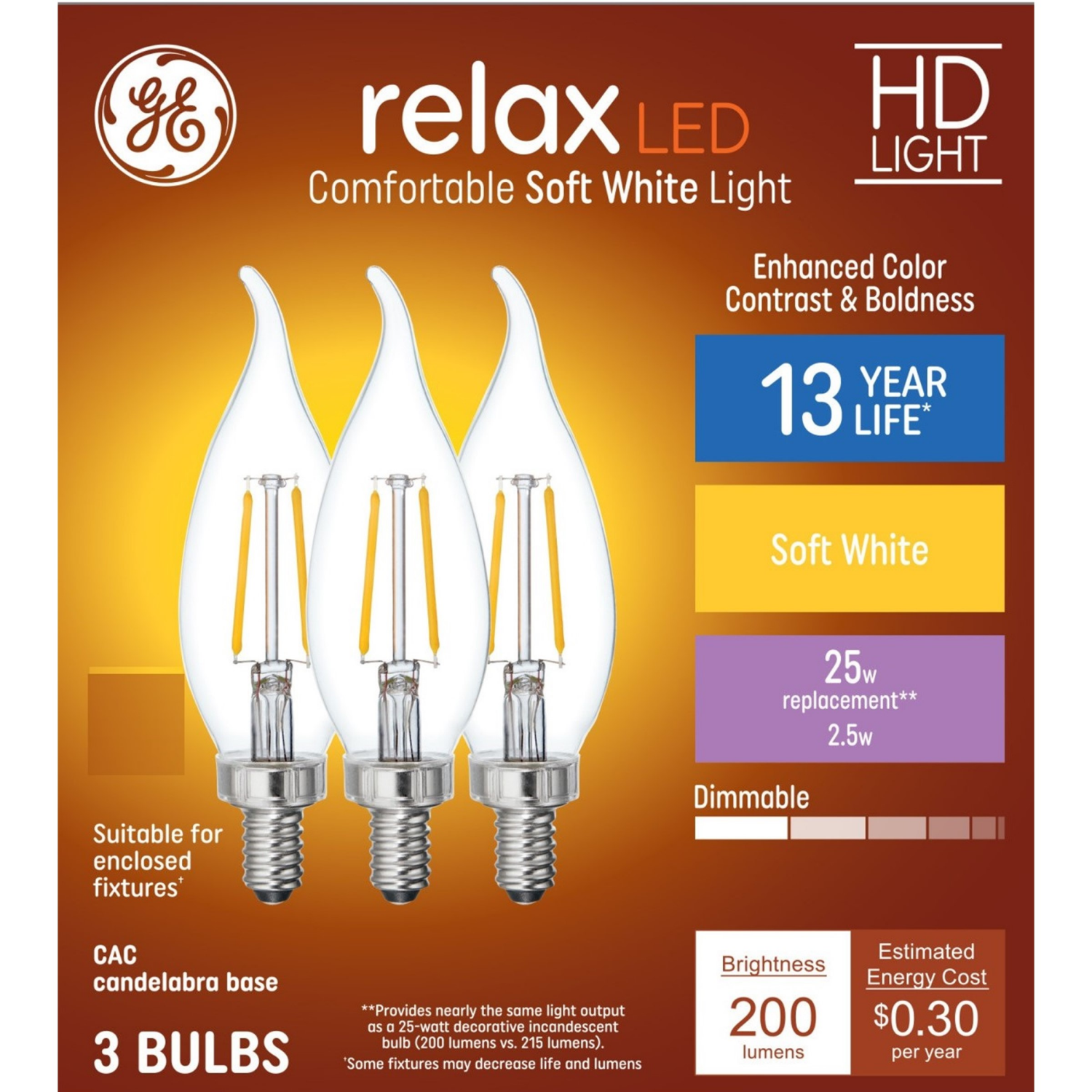 GE Relax HD 25-Watt EQ CAC Soft White Candelabra Base (e-12) Dimmable LED Light Bulb (3-Pack)