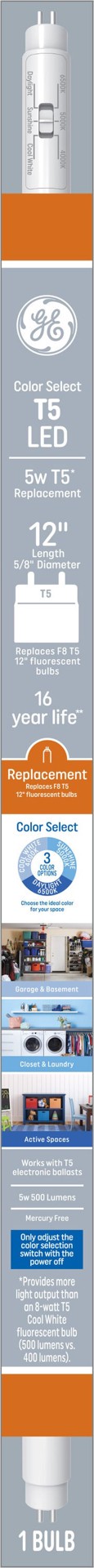 GE T5 LED Replacement 8 -Watt EQ T5 Color-changing Miniature bi-pin base LED Tube Light Bulb