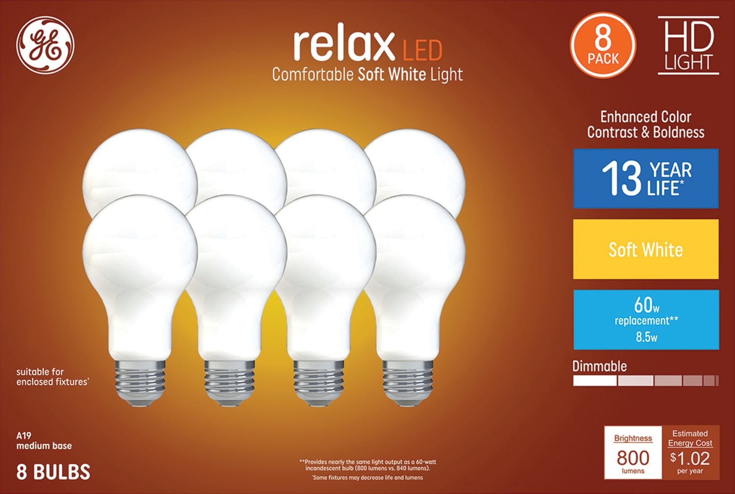 GE Relax 60 -Watt EQ A19 Soft white Medium base (E-26) Dimmable LED General purpose Light Bulb 8 -Pack
