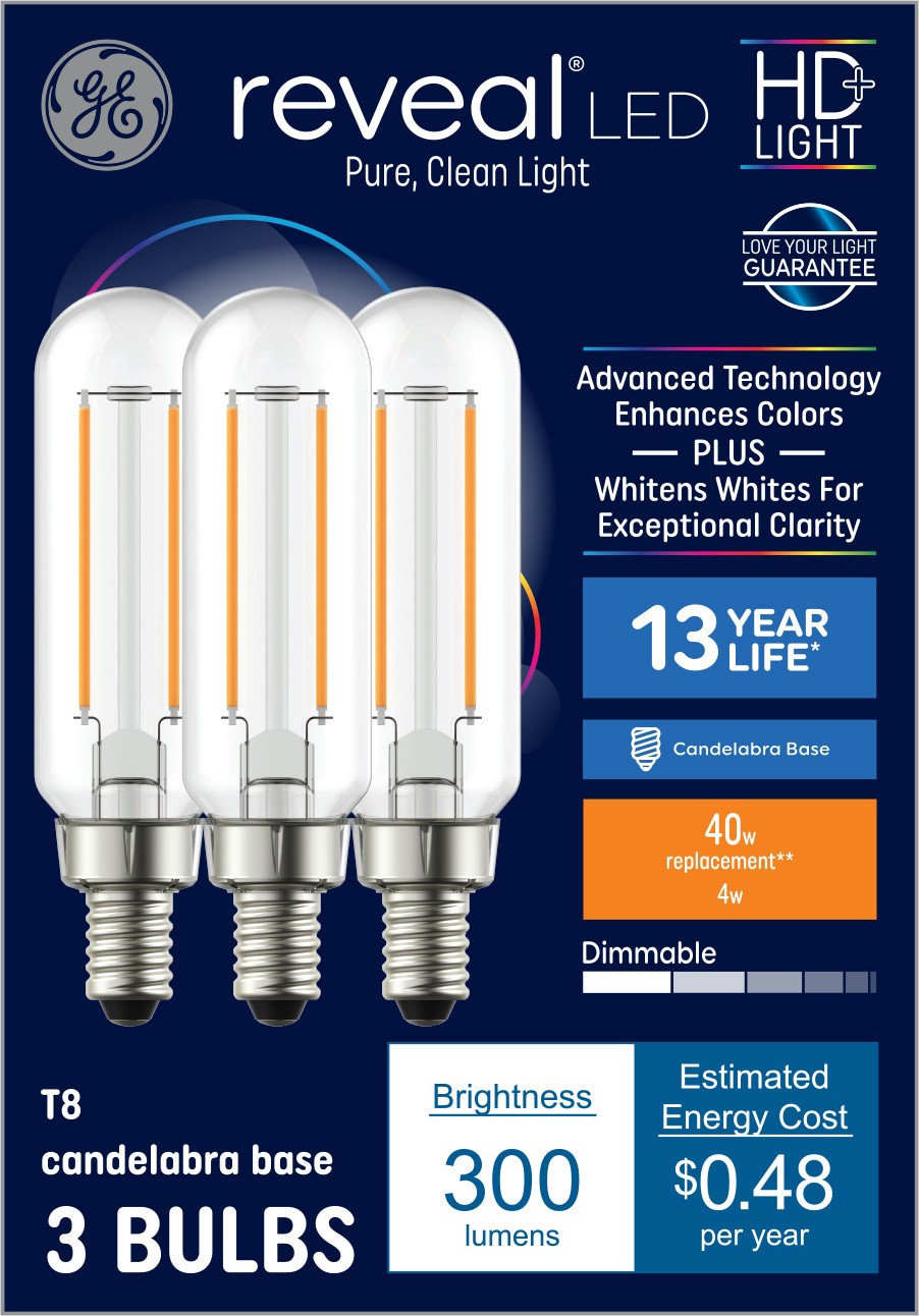 GE Reveal HD 40 -Watt EQ T8 Color-enhancing Candelabra base (E-12) Dimmable LED Decorative Light Bulb 3 -Pack