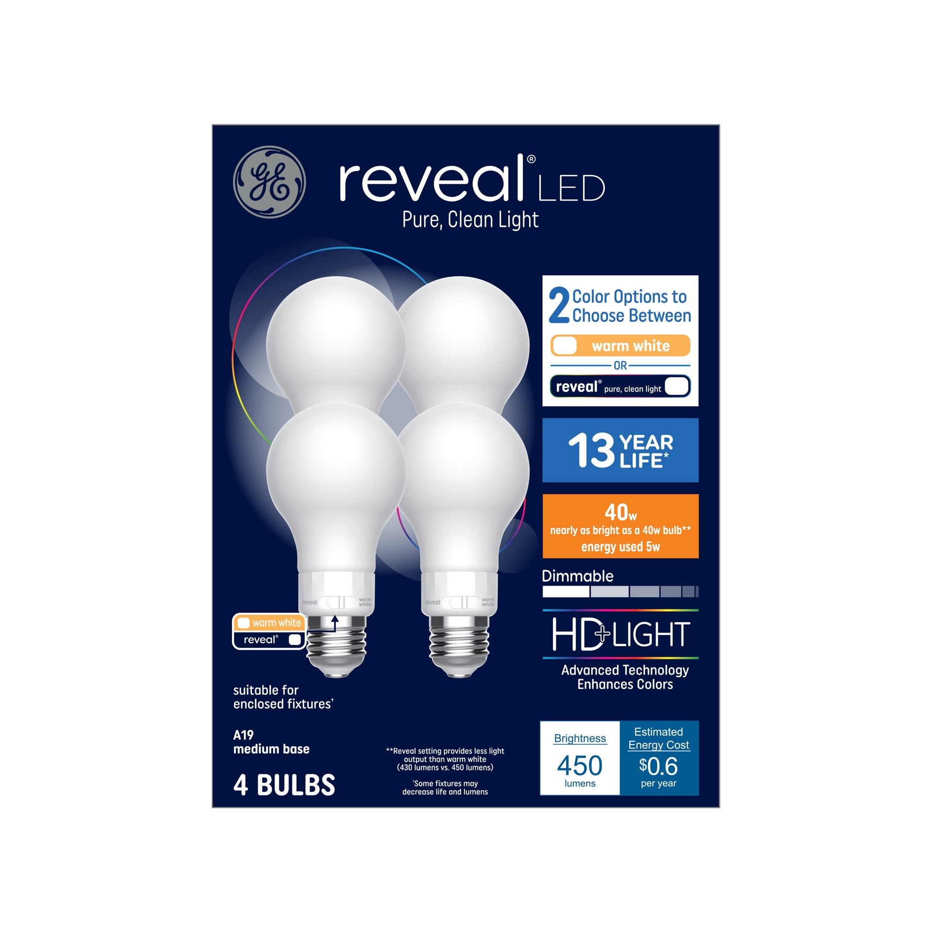 GE Reveal HD 40 -Watt EQ A19 Switchable white Medium screw base E26 Dimmable LED General purpose Light Bulb 4 -Pack