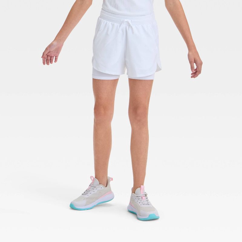 Why we're ALL IN:Two-in-one shorts in a solid hue with a mid-rise cut and an above-knee length. Feature loose-fit flared shorts with dolphin hems and side pockets along with built-in snug shorts. Made…