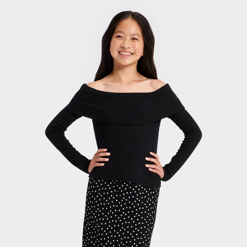 slide 3 of 3, Girls' Off the Shoulder Long Sleeve Knit Top - art class™ Black M, 1 ct