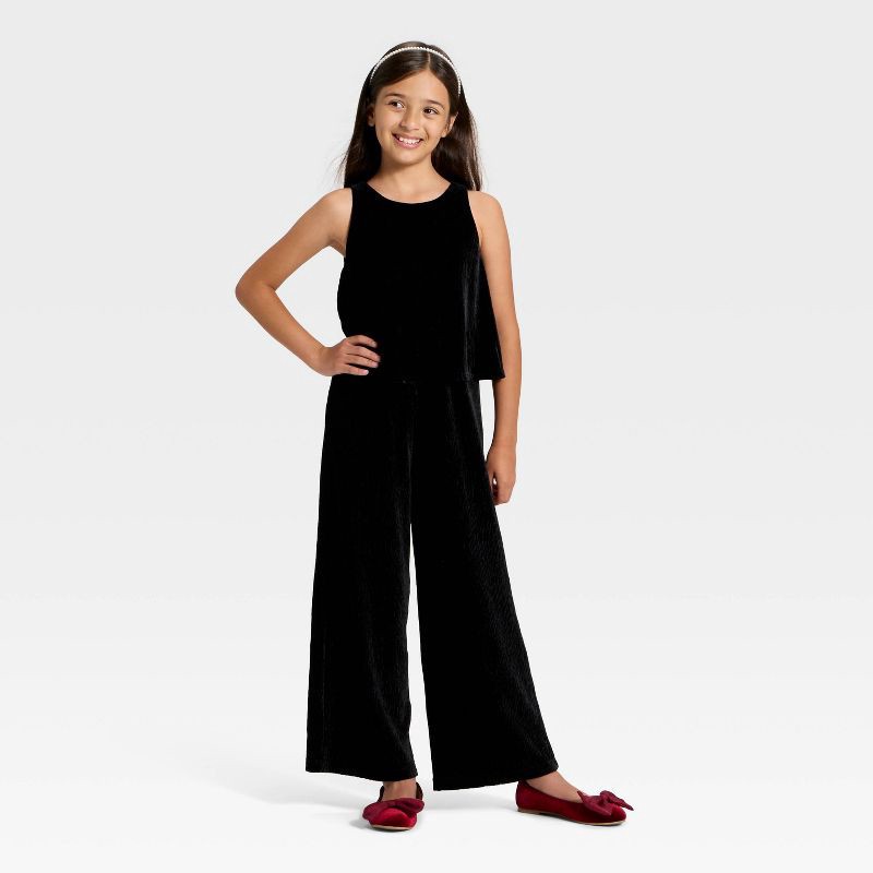 Elevate your kid's fashion game with this Velvet Jumpsuit from Cat & Jack™. Made from 100% recycled polyester, this sleeveless jumpsuit instantly elevates their looks. It sports a button-down back wit…