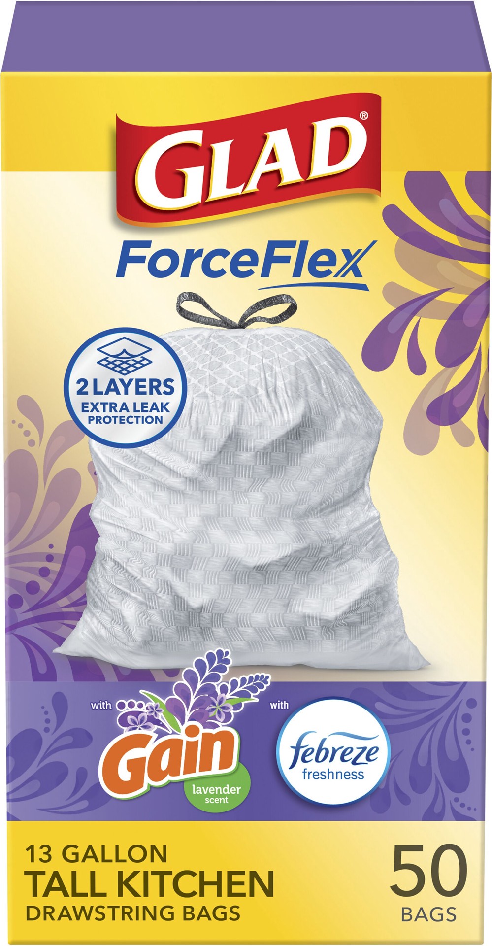 ForceFlex helps prevent rips and tears. 2 layers for extra leak protection. Gain Lavender scent with Febreze. FORCEFLEX STRENGTH: Glad's trusted ForceFlex technology allows the bag to stretch and expa…