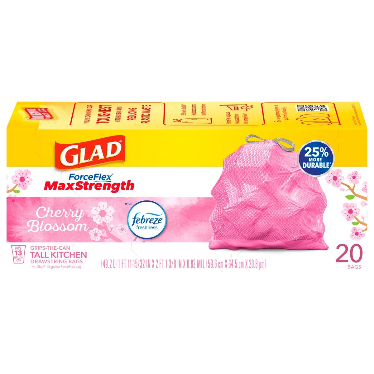 Glad ForceFlex MaxStrength Drawstring Tall Kitchen Trash Bags provide maximum strength and help you fight kitchen odors with the steady release of Cherry Blossom with Febreze freshness. Featuring doub…