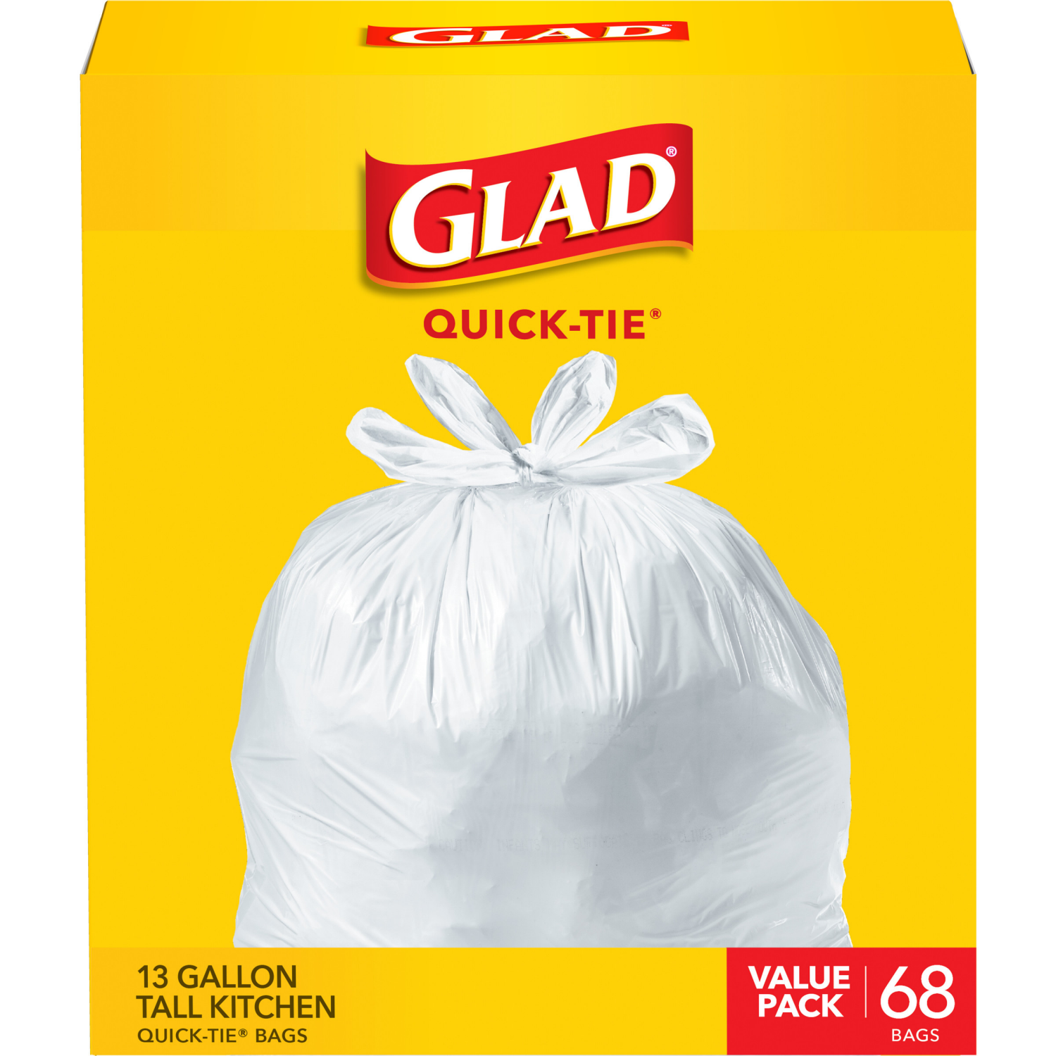 Glad Quick-Tie Tall Kitchen Trash Bags are strong and sturdy to contain and transport your big trash loads. Made with 3-ply strength and a unique diamond design, these Glad trash bags stretch at the t…