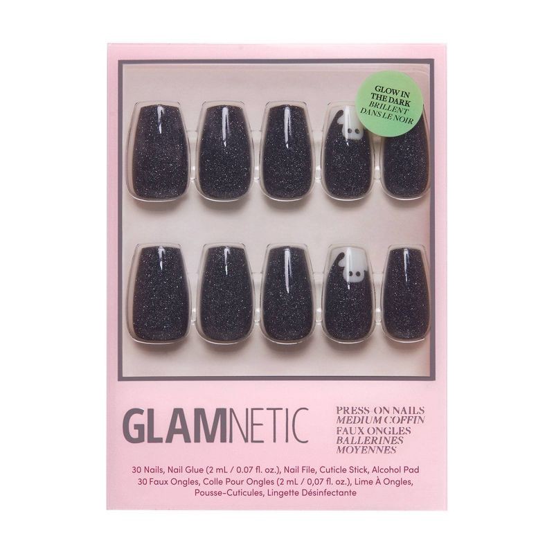 You can't hide from this statement-making Phantom Glow Nail Set! This new medium coffin shape is eerily perfect for all your spooky looks, featuring a sparkly black hue adorned with adorable ghost gra…