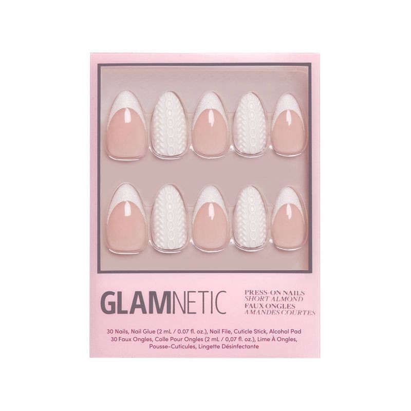 The Sweater Weather Nail Set features short almond nails with a sheer pink glossy base, accented by crisp glitter French tips. Cozy knit-inspired 3D detailing adds texture and charm, creating a chic, …
