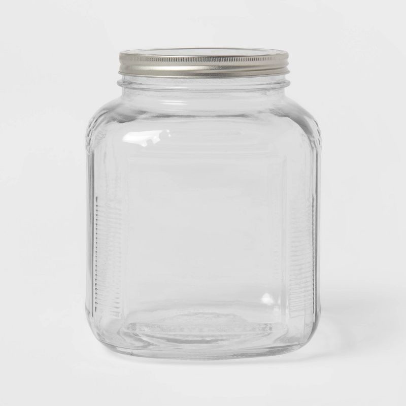 - 128oz glass jar with metal lid makes a practical kitchen or pantry essential