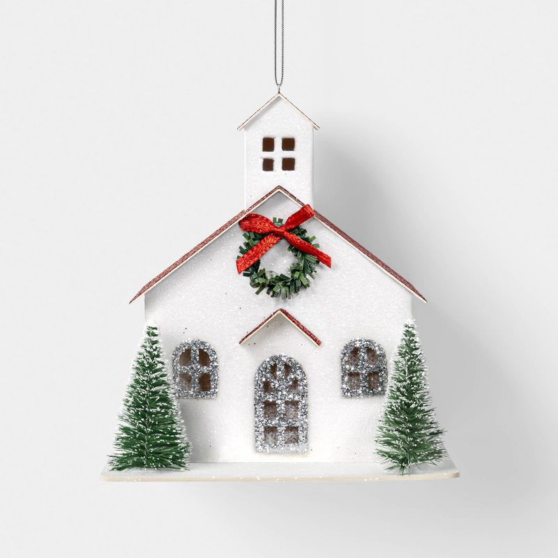 Bring classic charm to this year's tree with the Glittered Church with Bottle Brush Trees Christmas Tree Ornament from Wondershop™. This Christmas ornament is designed as a paper church with a wreath …