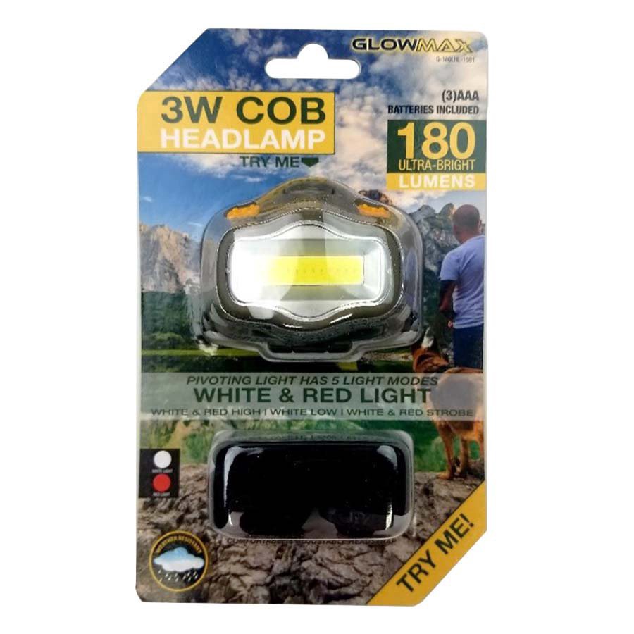 Glow Max COB Headlamp 180 Lumens 5 light modes for a variety of tasks. Ultra bright Light, water impact resistant 3 AAA batteries included