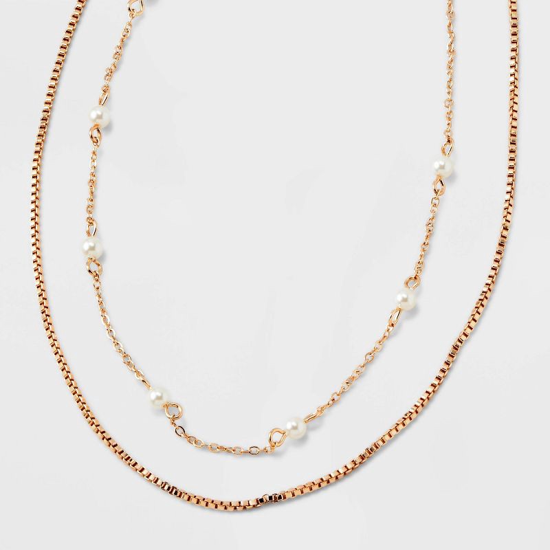 Get ready for any occasion in stunning style with the Gold 2-Row Clear Stone Pearl Ball Necklace from A New Day™. This gold-tone necklace features two rows of gold-tone chains with one adorned with fa…