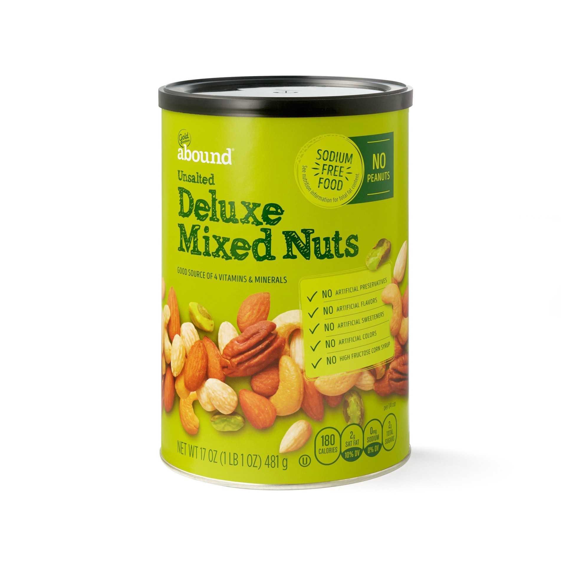Free from artificial: preservatives & flavors. Sodium free food. Good source of 4 vitamins & minerals. Per 1/4 Cup: 190 calories; 2.5 g sat fat (13% DV); 0 mg sodium (0% DV); 1 g sugars. We love our s…