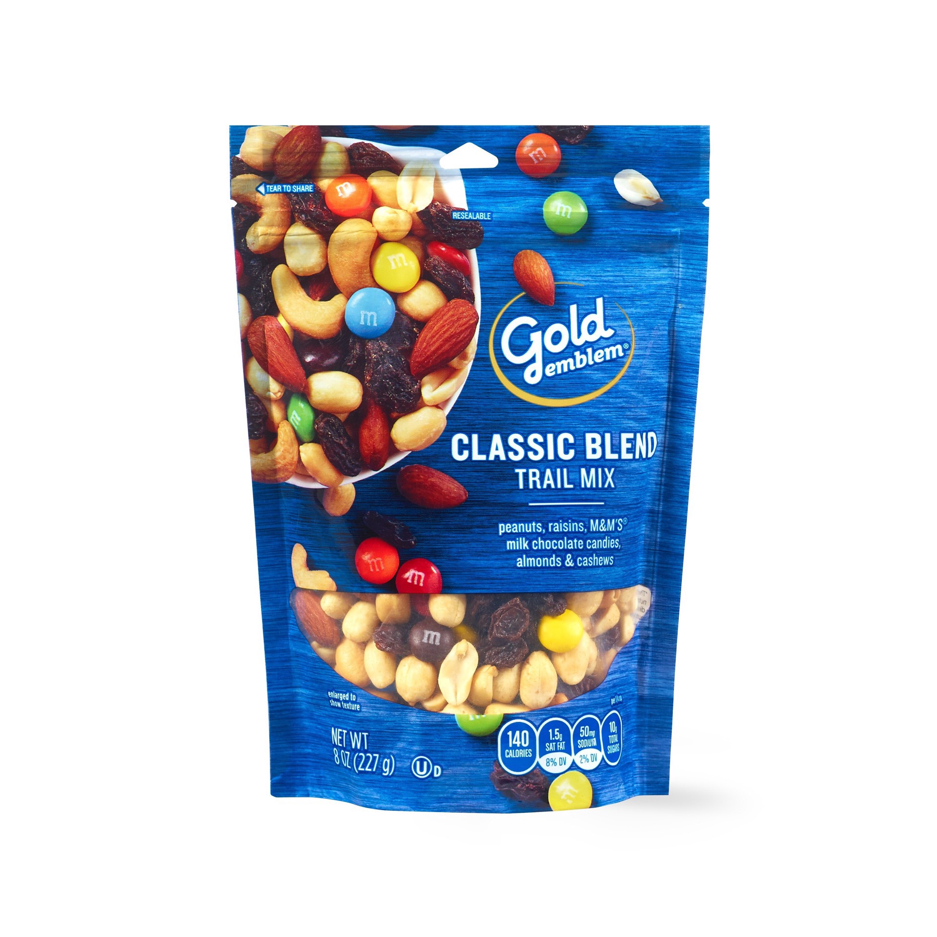 Gold Emblem Classic Blend Trail Mix is a timeless blend of crunchy nuts, chewy raisins, and sweet M&M's milk chocolate candies. With Gold Emblem, you can turn any day into a celebration. We make shari…
