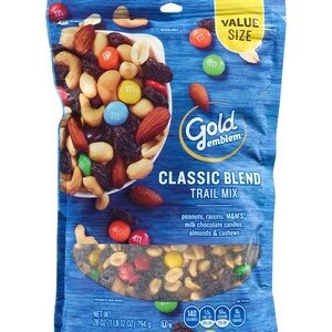 Raisins, peanuts, M&M'S milk chocolate candies, almonds & cashews -- Gold Emblem Classic Blend Trail Mix is a salted blend of crunchy nuts, chewy raisins, and sweet M&M'S* milk chocolate candies. -- O…