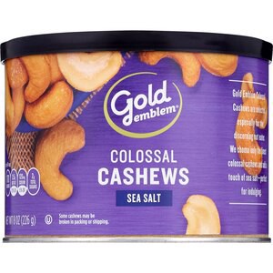 Per 1/4 cup: 170 calories; 2.5 g sat fat (13% DV); 60 mg sodium (3% DV); 1 g sugars. Contains 50% less sodium than the leading national grand of mixed nuts. Gold Emblem Colossal Cashews are selected e…
