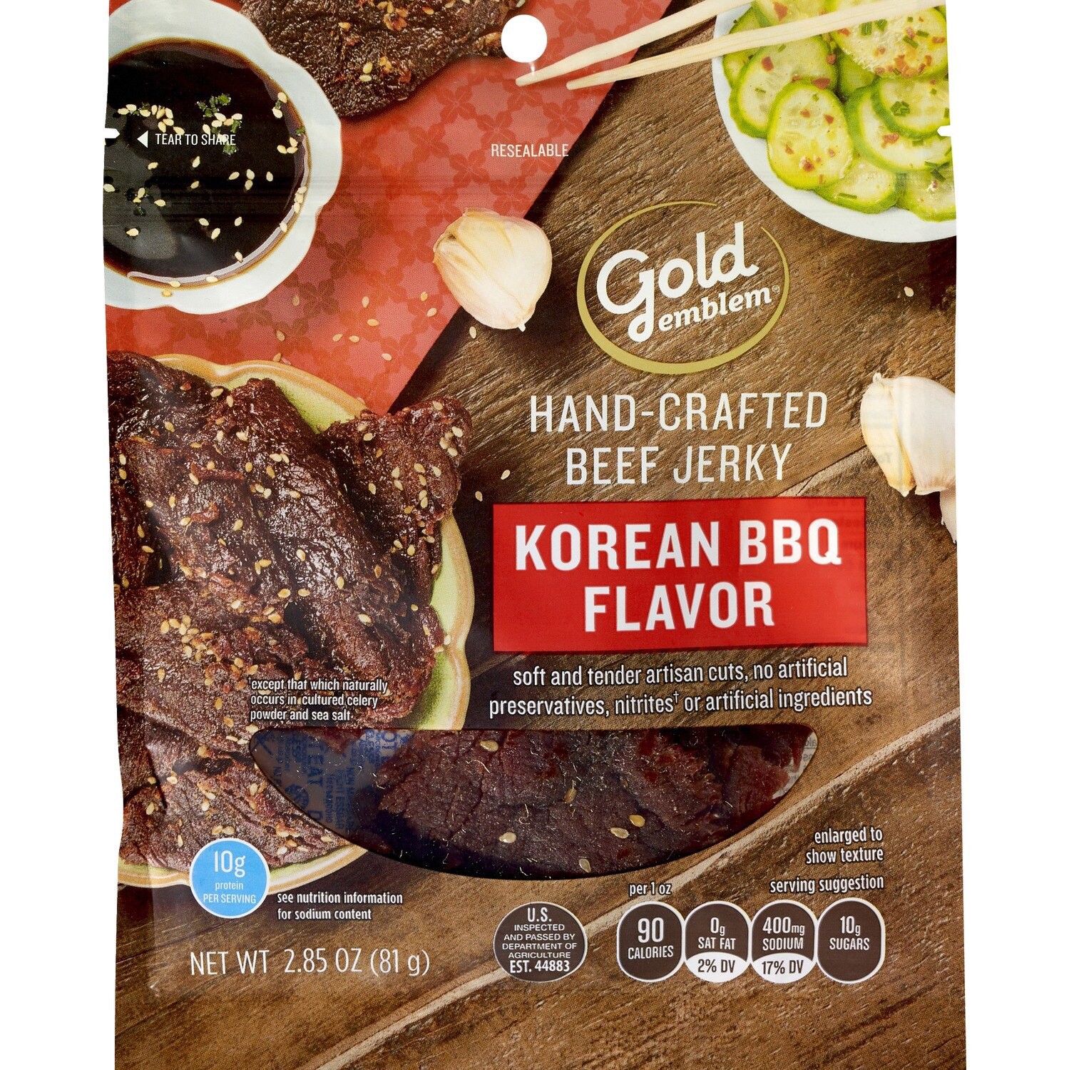 Gold Emblem Korean BBQ Flavor Beef Jerky is an artisan jerky that's hand crafted with soft and tender solid strips of beef. Marinated in traditional Asian flavors like soy sauce, mirin and sesame, thiā¦