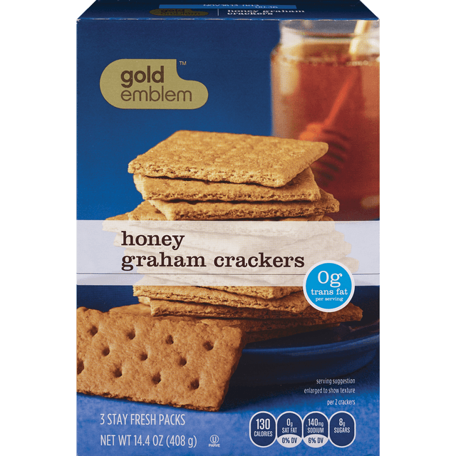 3 stay fresh packs. 0 g trans fat per serving. Per 2 Crackers: 130 calories; 0 g sat fat (0% DV); 140 mg sodium (6% DV); 8 g sugars. Gold Emblem Honey Graham Crackers are bursting with traditional gra…