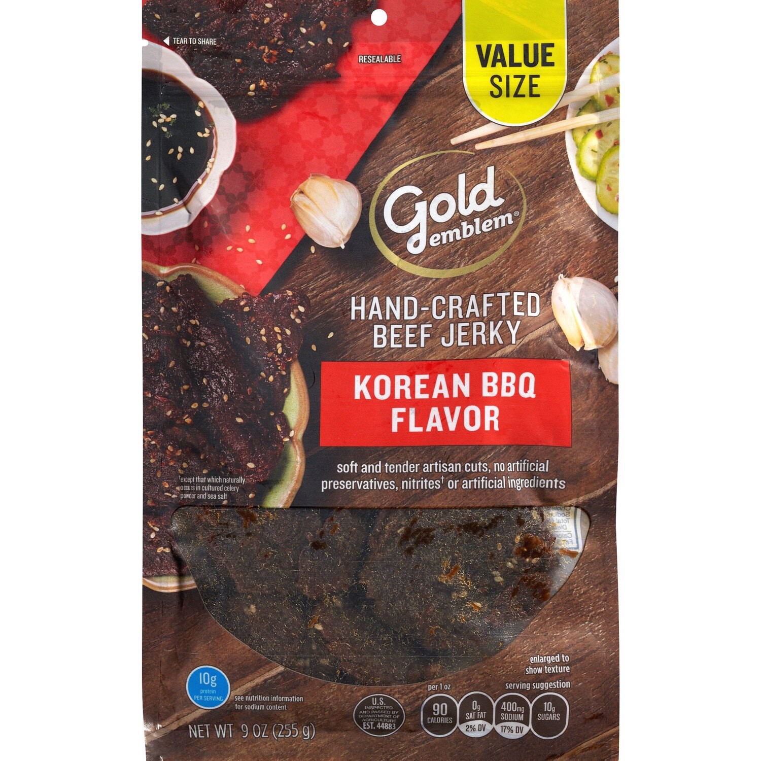 Gold Emblem Korean BBQ Flavor Beef jerky is an artisan jerky that's hand credited with soft and tender solid strips of beef. Mirin and sesame. This tantalizing treat has all the flavors of your favori…