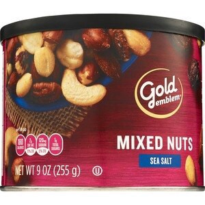 Made with sea salt. Less than 50% peanuts. Per 1/4 cup: 160 calories; 2 g sat fat (10% DV); 110 mg sodium (5% DV); 1 g sugars. Gold Emblem Mixed Nuts are a perfectly balanced blend of everyone's favor…