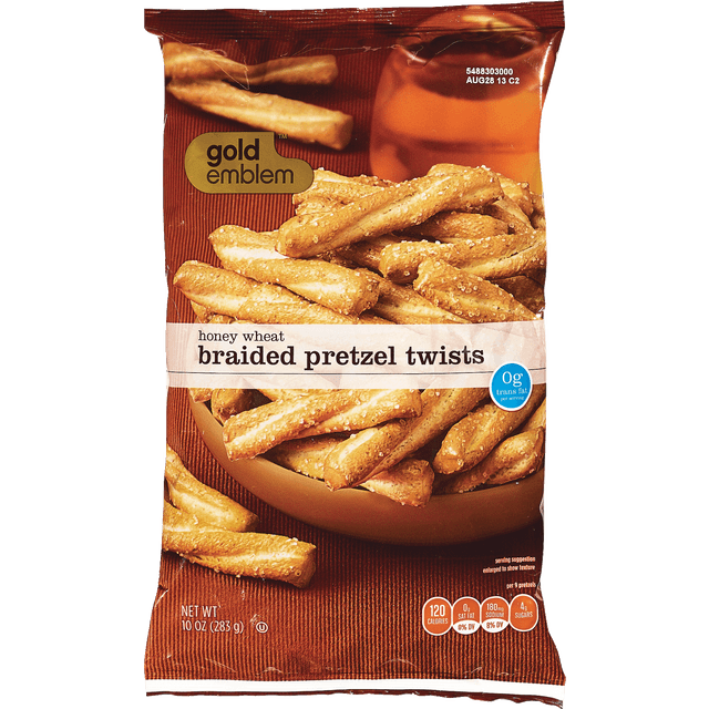 0 g trans fat per serving. Per 9 Pretzels: 120 calories, 0 g sat fat (0% DV), 180 mg sodium (8% DV), 4 g sugars. Gold Emblem Honey Wheat Braided Pretzel Twists perfectly blend honey and wheat into gol…