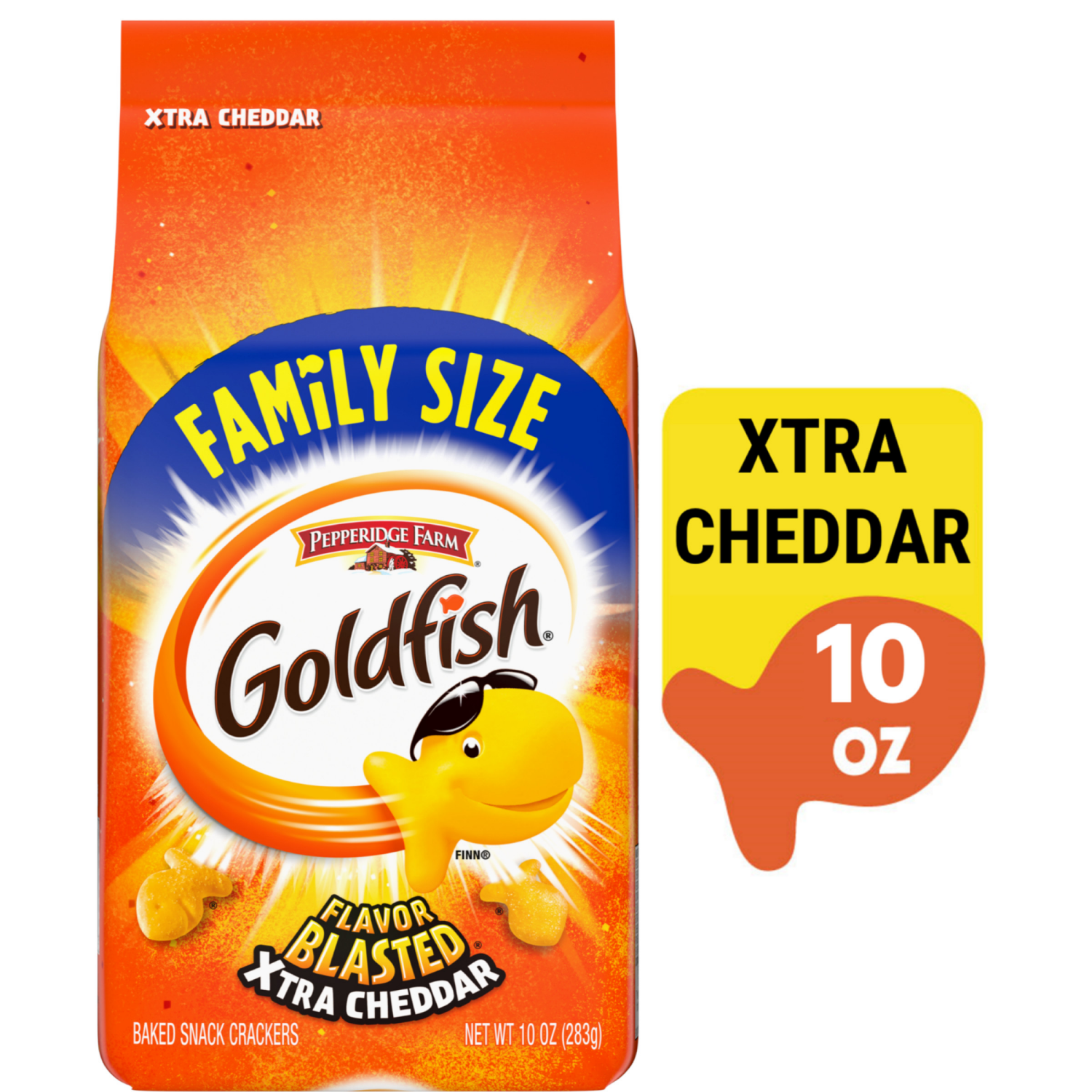 Kick snack time and movie time up a notch with the intense munchable, crunchable flavor of Pepperidge Farm Goldfish Flavor Blasted Xtra Cheddar crackers. They''re baked with real cheese and are made w…