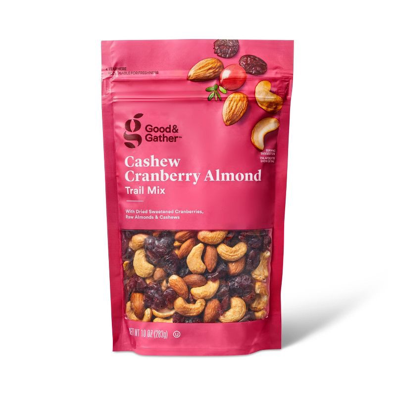Treat your taste buds to the crunchy, fruity flavor of the Cashew Cranberry Almond Trail Mix from Good & Gather™. Made with dried sweetened cranberries, raw almonds and cashews, this mix offers a deli…